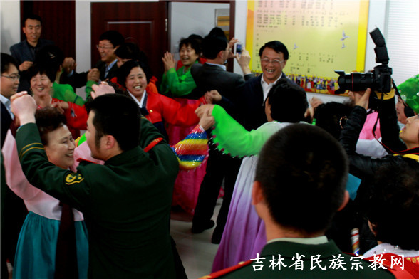 调研组一行与驻街部队官兵和社区居民跳起了民族舞蹈 (金燕 摄)