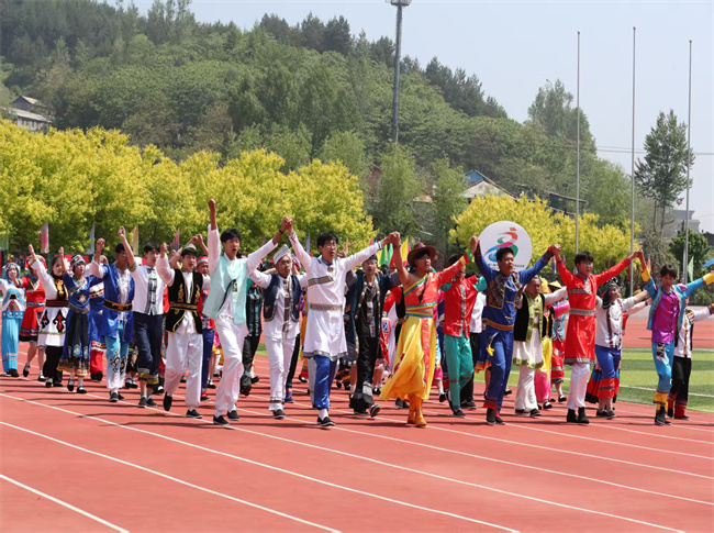 吉林省第八届少数民族传统体育运动会开幕,各民族团结方队入场。